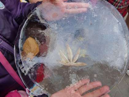3枚目の写真は、落ち葉を散らせたバケツの水に張った氷です。クリスタルガラスのような自然の芸術作品です。(発信:副校長 岡田香子)