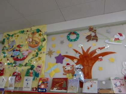 図書室の掲示もクリスマスバージョン。クリスマスや季節にちなんだ本も紹介されています。