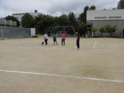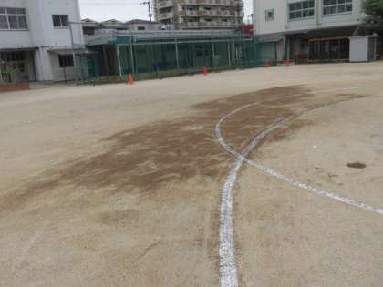 昨日の雨でぬかるんだ運動場を