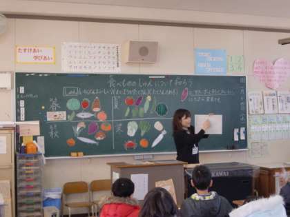 鶴見区内の小学校の栄養教諭の先生に来ていただき、2年生が栄養教育を受けました。テーマは「食べもののしゅんについて知ろう」でした。