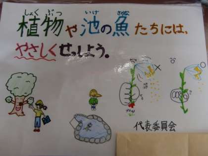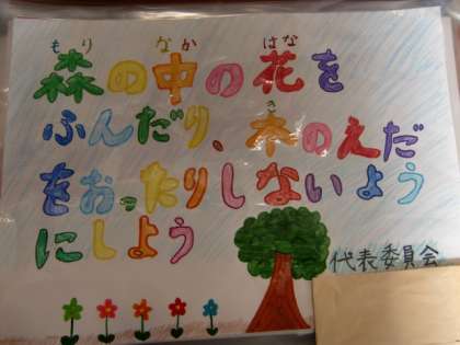 みんなのえの森を、みんなで大切にしていけるよう、全校児童に呼びかけていきます。