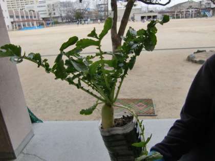 右の写真は、途中で間引いた大根を、ためしにペットボトルに植えてみたものです。畑のものより細くて短いですが、思ったより立派に育ちました。
