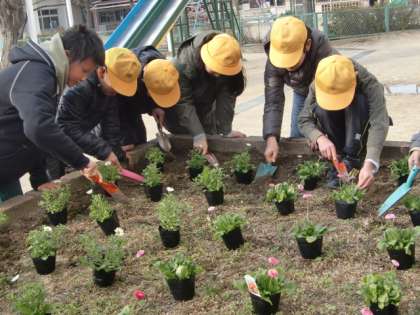 学校を花いっぱいの心のオアシスにしようと、栽培委員会が花の苗を植えました。クリサンセマム ノースポール、デージー、パンジー、ビオラの4種類です。