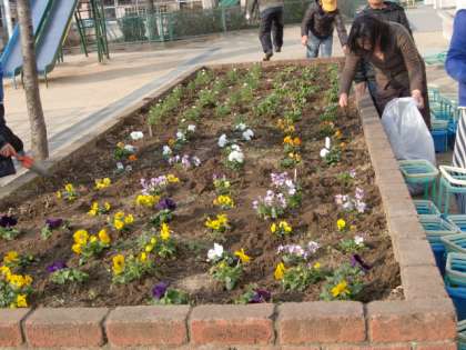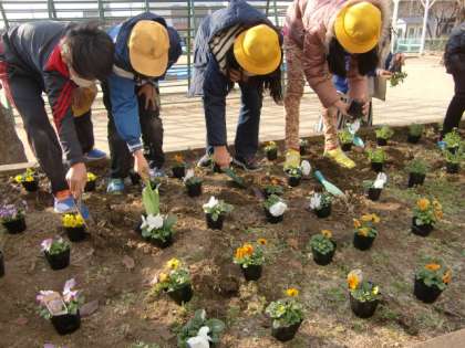 花の色合いを考えて並べ方を決め、花壇に線を引いてまっすぐになるように植えていきました。植え終わった後は、みんな満足そうな表情で、「きれいやな〜」とささやきあっていました。これから大事に世話をしていきます。