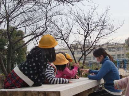 ロウバイがいつの間にか花開いており、香りを嗅いだ子どもたちは「なんだかはちみつレモンみたい〜」と、まったりしていました。