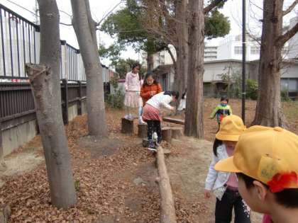 えの森の伐採木でつくったアスレチックも、相変わらず大人気。両側からスタートし、出会ったところでじゃんけんぽん!勝った人が前へ進めます。