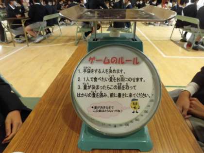 まずは、班ごとにポテトチップスを自分が満足する量をはかりとります。