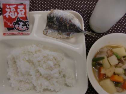いわしと大豆が、明日の節分にちなんだメニューです。各ご家庭では、「豆まき」をされるでしょうか?いわしの頭をヒイラギにさして飾るご家庭もあるでしょうか?