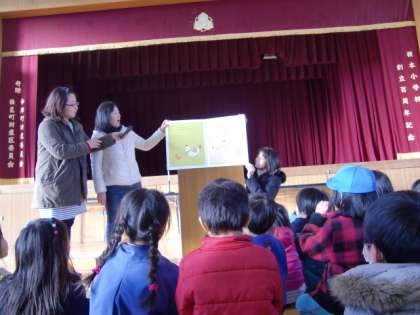 説明会の最後には、読み聞かせボランティア、ハッピー・タイムさんからの絵本のプレゼントが。少々退屈気味(?)だった子どもたちも、前のほうに駆け寄ってきて、「たまごにいちゃん」の世界に瞳を輝かせていました。