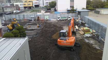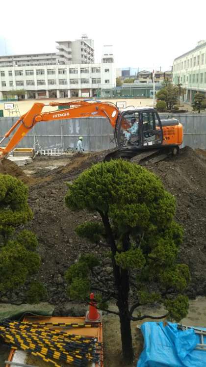 新校舎の増築工事の様子です。たくさんの重機が動いています。基礎の工事が進んでいるようです。