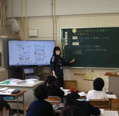 3けたの数をかける筆算の仕方を考えました。計算の仕方が複雑になってきましたが、ていねいに計算していました。