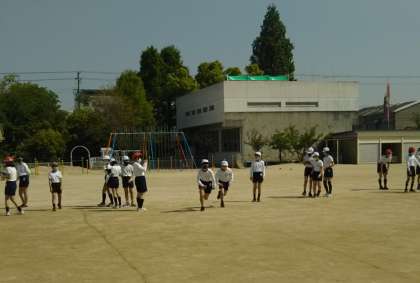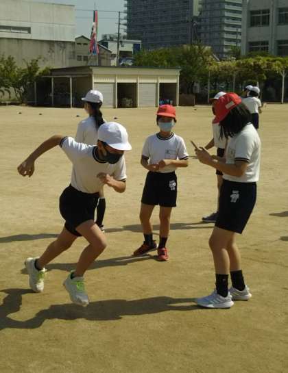 運動場では、短距離走をしています。ここでもタブレットを活用しています。