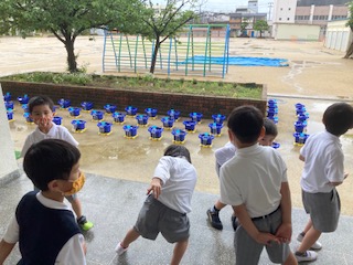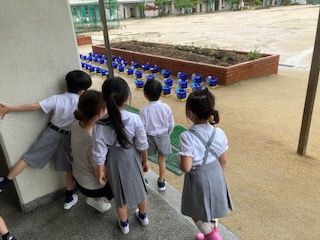 アサガオが成長してくると、雨の日も楽しみが増えるかな。