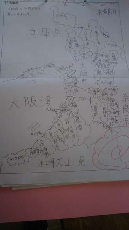 大阪府にある『市』『町』『村』の学習です。たくさんあることに驚いています。がんばって、覚えています。