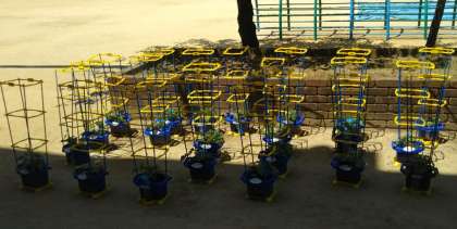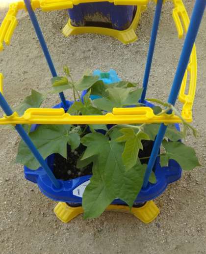 アサガオがたくさん葉をつけ、ツルも伸びてきました。植木鉢に支柱を付けました。