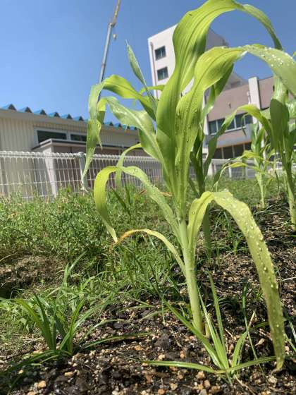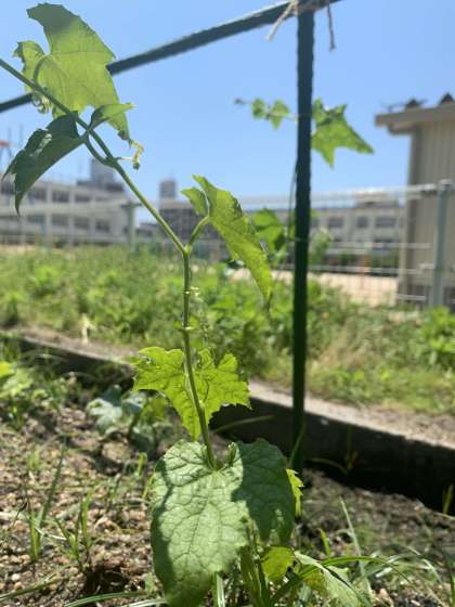 えの森の学習園ではギラギラの日差しの元、ヘチマとトウモロコシがぐんぐん育っています。理科の学習で花の育ちを観察する予定です。