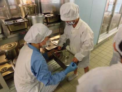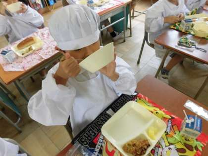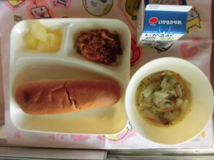今日の献立は、黒糖パン・カレードリア・豚肉とキャベツのスープ・りんごのかんづめ・牛乳です。