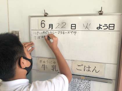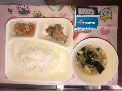 今日の献立は、ごはん・豚肉の甘辛焼き・すまし汁・切り干し大根のいため煮・牛乳です。