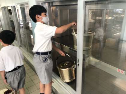 受け取った食缶は 取りやすいように 奥に押しこんで