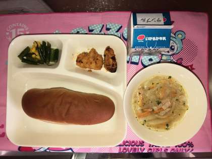 今日の献立は、黒糖パン・鶏肉のカレーマヨネーズ焼き・てぼ豆のスープ・三度豆とコーンのサラダ・牛乳です。