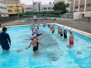 1年生の2学級が初めてプールに入りました。2,4,5年生も2学級ずつプール開きをしました。