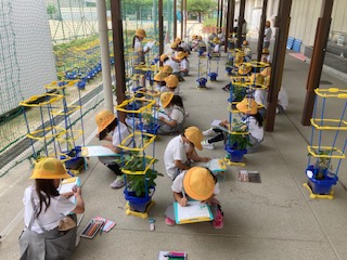 2年生は育てている野菜の観察です。ミニトマト、ピーマン、オクラ等、大切に育てています。