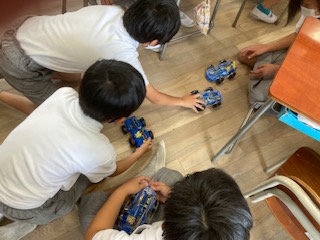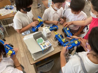 理科「電気のはたらき」の学習でモーターカーを作成しています。友だちと教えあって作ったり、完成した車を走らせたりしています。
