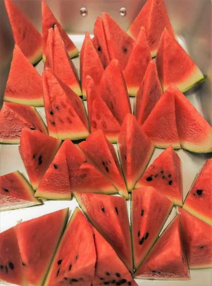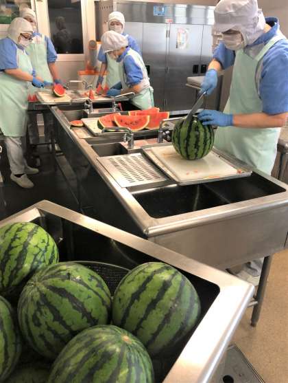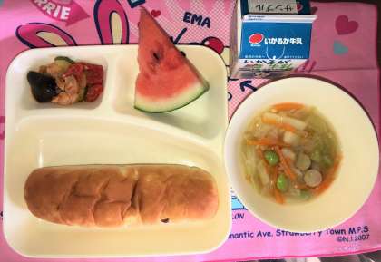 今日の献立は、おさつパン・鶏肉と夏野菜のソテー・押し麦のスープ・すいか・牛乳です。