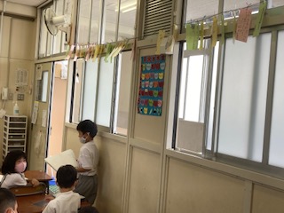 2年生の教室では、子どもたち自身で答え合わせをすすめたり、授業のまとめをみんなで声を出して読むことで確かめたりしていました。七夕の日を迎える前に短冊に願いを書き、教室に飾っています。願いが叶うといいですね。