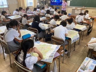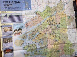 社会科の学習で、大阪市24区の名前と場所を覚えることができているか確認をしていました。