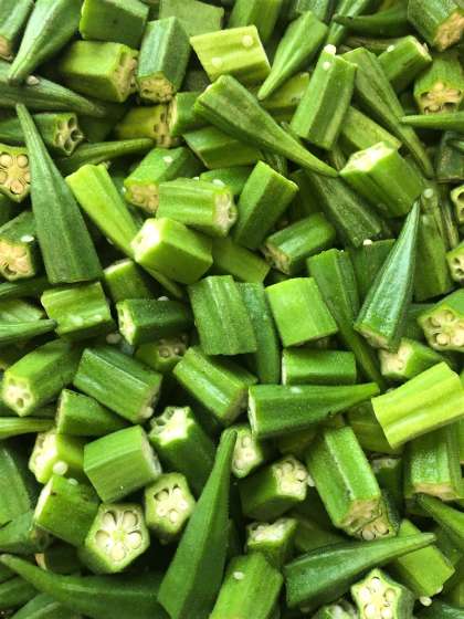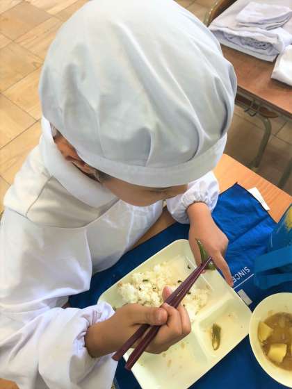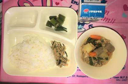 今日の献立は、ごはん・豚肉とじゃがいもの煮もの・オクラの梅風味・ツナっ葉いため・牛乳です。