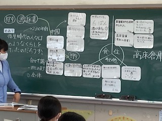 6年生は社会科の学習で、電子黒板を活用したり、グループの考えを共有したりして弥生時代の人々のくらしについて理解を深めました。