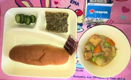 今日の献立は、コッペパン・いちごジャム・もずく入りヒラヤーチー・豚肉とあつあげの煮もの・あっさりきゅうり・牛乳です。
