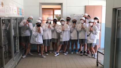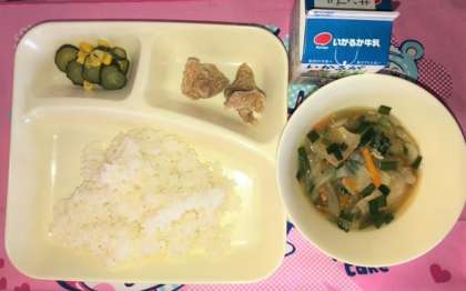 今日の献立は、ごはん・鶏肉のからあげ・中華みそスープ・きゅうりとコーンの甘酢あえ・牛乳です。