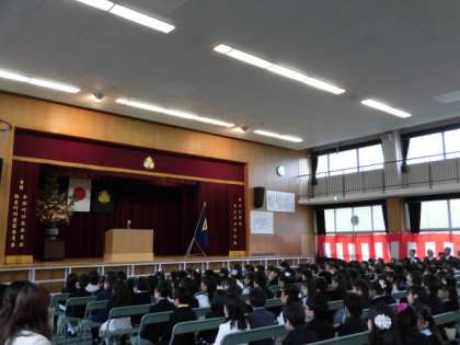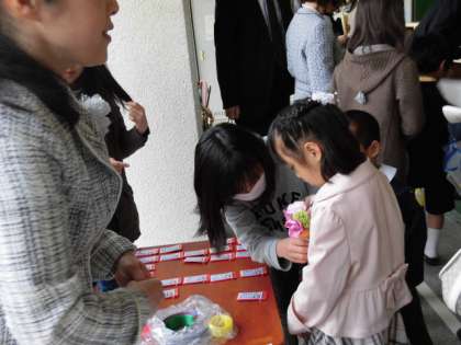 6年生に名札をつけてもらうと、恥ずかしげながらも、ちょっぴり誇らしげな表情です。足の届かない講堂の椅子にも、よい姿勢で、行儀よく座ることのできた1年生。校長先生のお話やPTA会長さんのお話も、しっかりと前を向いて聞いていました。