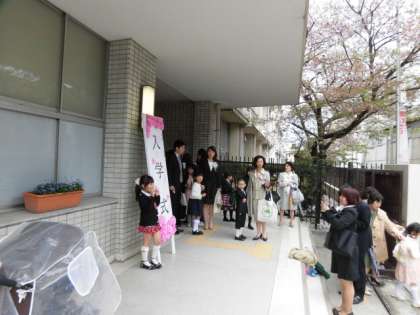 特に玄関の「入学式」の看板前での撮影には、長蛇の列ができていました。1年生の教室前の桜の下でも、えの森の前でも、とびきりのスマイルをカメラに向けている子どもたちや、笑顔でファインダーをのぞく保護者の方々の姿が見られました。