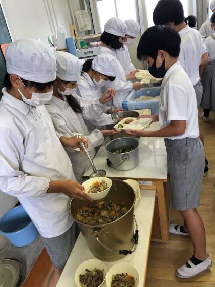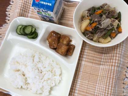 今日の献立は、ごはん・肉じゃが・あつあげのみそだれかけ・あっさりきゅうり・牛乳です。