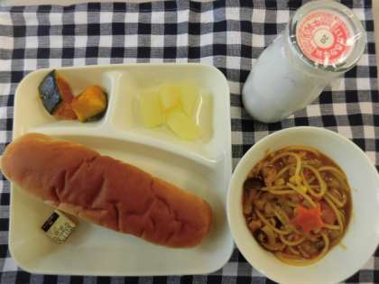 カレースープスパゲッティ、かぼちゃのバター焼き、りんご缶
