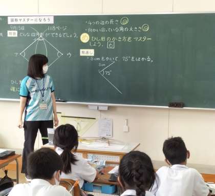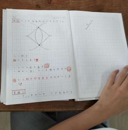 ひし形の書き方をマスターします。定規やコンパスの使い方も上手になってきました。