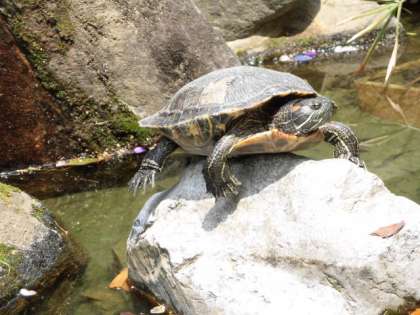 えの森は、まだ花の残る桜と新緑とのコントラストが大変きれいです。亀池では、亀吉が岩の上で絶妙なバランスを保って甲羅干しをしていました。