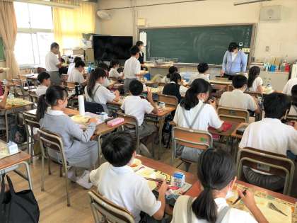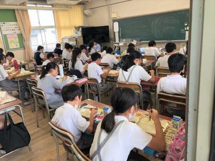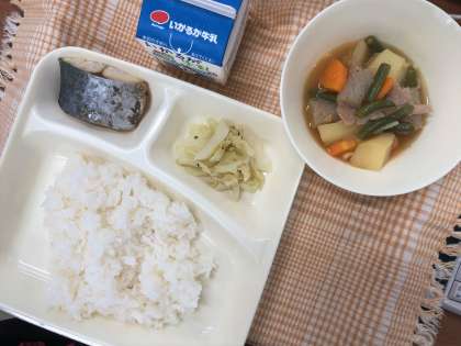 今日の献立は、ごはん・さごしの塩焼き・豚肉とじゃがいもの煮もの・キャベツの梅風味・牛乳です。
