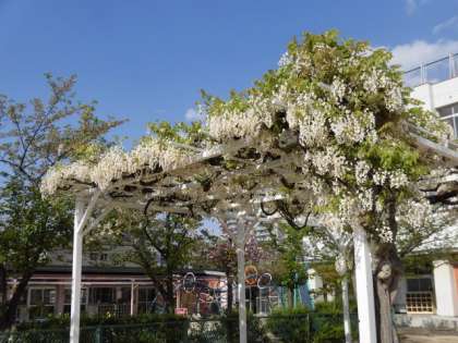 砂場の上の藤棚では、白いフジが満開です。藤色でないのが不思議な感じですが、晴天によく映えています。