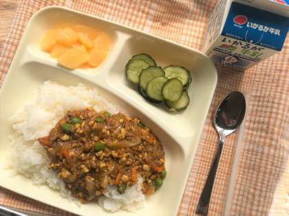 今日の献立は、大豆入りキーマカレーライス(米粉)・きゅうりのピクルス・白桃かんづめ・牛乳です。
