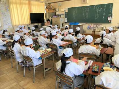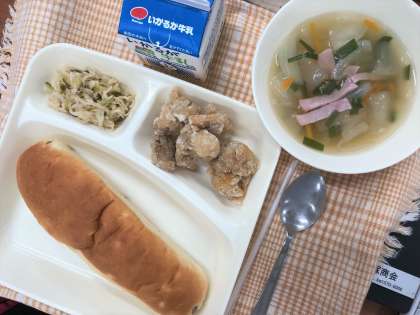 今日の献立は、おさつパン・鶏肉のからあげ・とうがんの中華スープ・切り干しだいこんのごま辛みづけ・牛乳です。