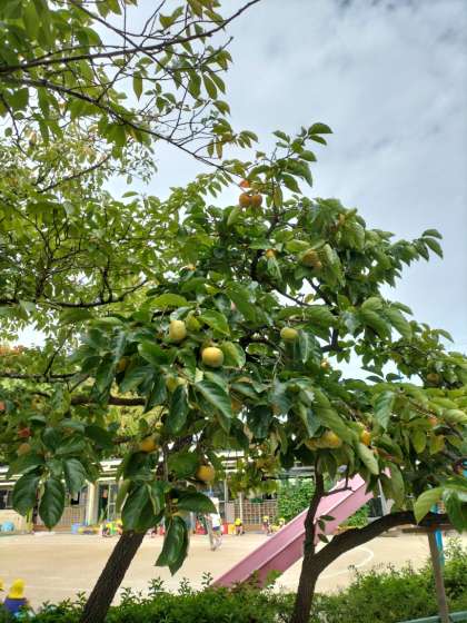 お隣の榎本幼稚園の柿の木です。大きな柿の実がなっています。さて甘柿か渋柿かどちらでしょうか?
