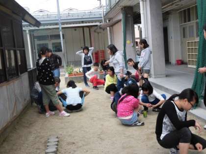 理科室と飼育小屋の間では、6年生が理科の燃焼実験を行っていました。
