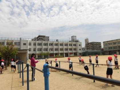 運動場では2年生が、鉄棒やはんとう棒にチャレンジしています。