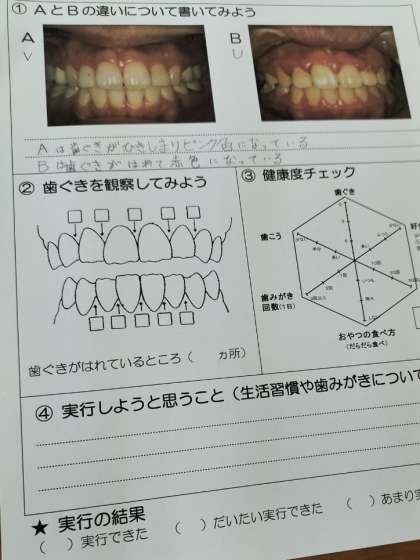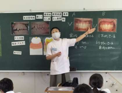 歯科衛生士の方に来ていただき、歯を大切にすることについて教えていただきました。お話を聞いたり、実際の写真を見せてもらったりしながら勉強しました。
