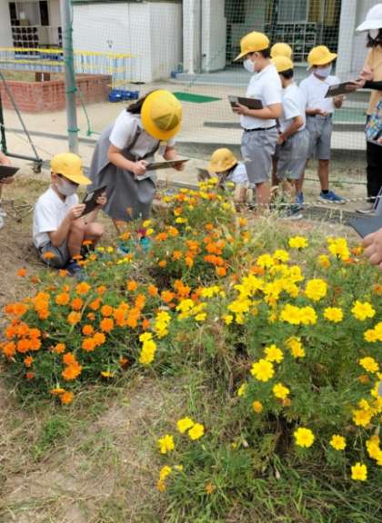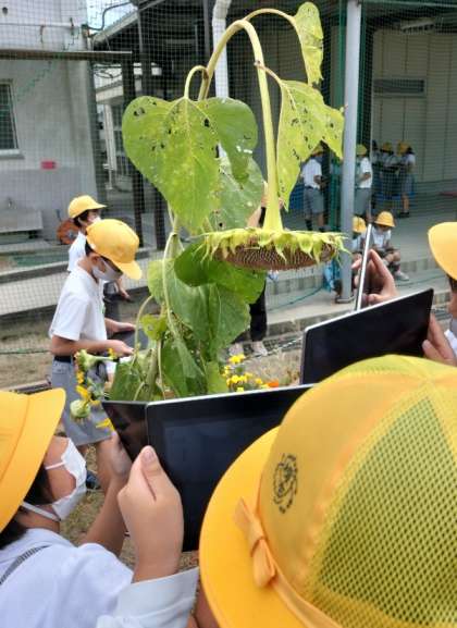 ヒマワリの花が枯れた後にできる種の様子やマリーゴールド、ホウセンカの様子をタブレットを活用して、観察しています。