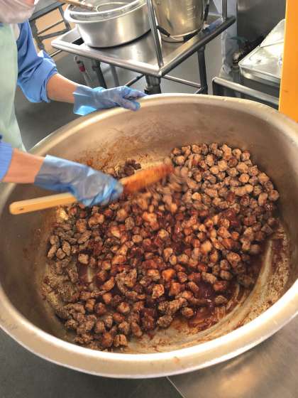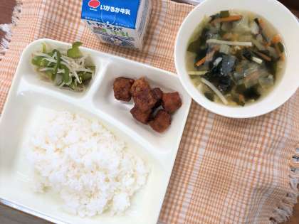 今日の献立は、ごはん・まぐろのオーロラ煮・すまし汁・もやしとピーマンのいためもの・牛乳です。